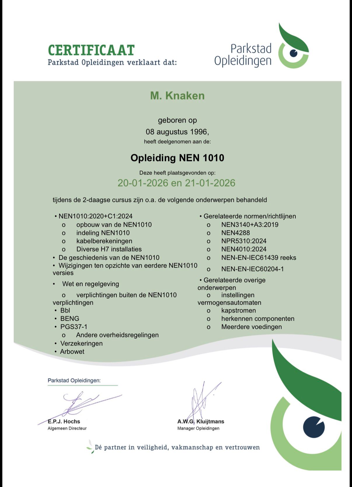 Wij zijn voorzien van de huidige NEN1010 en NEN3140 certificaten, en zijn altijd op de hoogte van de nieuwste richtlijnen.